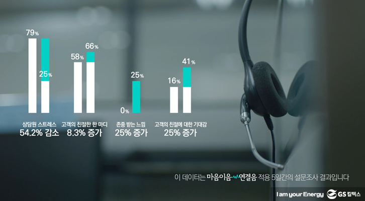 우리는 이를 해결하고자 고객과 상담원이 연결되는 지점에 ‘폭언을 차단하는 아이디어’를 생각하였습니다. 이 아이디어를 통해 GS칼텍스와 한국지엠은 상담원 업무 개선을 위한 협업을 진행하게 되었습니다. 관련 개발 사항이 빠르게 착수되었고 우리는 고객과 상담원들의 통화 직전, 상담원도 누군가의 가족임을 떠올릴 수 있는 목소리를 넣어 그들의 마음을 잇는 ‘마음이음 연결음’을 만들고 실제로 적용하게 되었습니다.