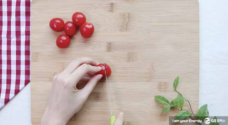 1) 대추 방울토마토가 하트 반쪽 모양이 되도록 45도 각도로 잘라주세요.