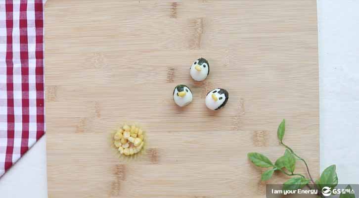 3) 캔옥수수를 하나씩 얹어 부리를 만들어주세요.