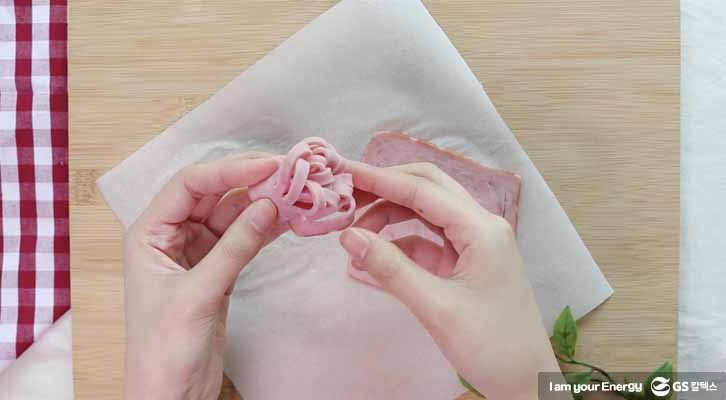 2) 칼집을 낸 슬라이스햄을 반으로 접고, 돌돌돌 말아서 꽃 모양을 만들어주세요.