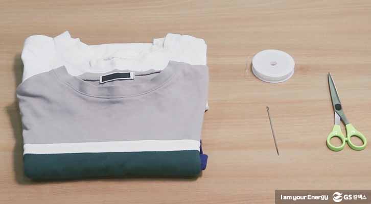 목 늘어난 티셔츠, 우레탄 줄, 가위, 큰 바늘