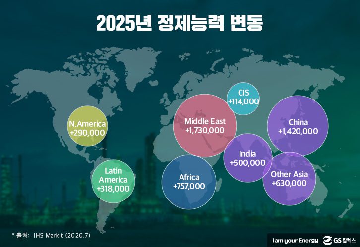 OPEC이 2019년 발간된 장기 보고서에서 향후 주요 석유수요 성장지역인 아시아 지역의 중동지역 원유 수입의존도가 2018년 64%에서 2040년 69%로 상승할 것으로 전망했다는 점도 중동 산유국의 장기 석유시장에서의 중요도를 보여주는 지점이다. 코로나19로 인한 석유수요 감소와 이에 따른 정제처리 축소로 인해 IHS는 올해 정제처리량이 전년대비 6.6백만b/d 감소될 것으로 보고 있다. 또한, 2023년이 되어야 2019년 수준의 수요가 회복된다고 보고 있는 반면, 세계정제능력은 2019년 대비 약 5백만b/d 추가되어 단기적으로 상당한 과잉정제능력을 예상했다. 2023~2030년 석유제품 수요의 점진적 증가로 연간 0.6백만b/d 수준의 정제처리 증가를 예상했으며 대부분 아시아, 중동에 집중될 것으로 예상했다. 이는 동 지역에 예정되어 있던 정제 시설 증설 프로젝트(2025년까지 전 세계 신규 정제능력 5.7백만b/d 중 75%가 아시아, 중동시장으로 예상)가 가동을 개시함에 기인한다. 과잉정제능력과 더불어 석유제품 수요가 2030년대 후반이 되면 정점에 달할 것이란 전망(휘발유 2031년, 수송용 경유 2037년 등 전체 석유제품 수요 2036년 피크)도 정제시장을 압박하고 있으며 이에 석유제품 수출국의 경쟁은 고조될 것으로 보인다.