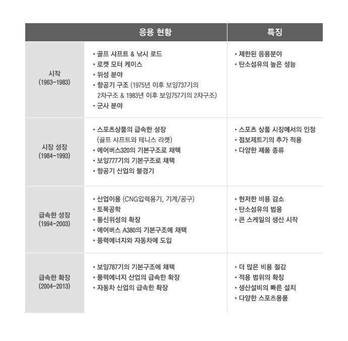 탄소섬유는 기계적 강도가 뛰어난 고분자(PAN)계와 탄성률과 기능성이 뛰어난 핏치(Pitch)계로 나뉘어집니다. 각각 물성에 따른 응용분야를 가지고 있지만 범용 제품에 있어서는 공통된 응용분야를 가지고 있습니다. 핏치계 탄소섬유의 경우 형태에 따라 단섬유와 장섬유로 나뉘어지며 이에 따라 응용분야가 구분되기도 합니다. 초기 개발과 함께 위성, 군사 분야에서 한정적으로 사용되던 탄소섬유는 스포츠상품산업의 급속한 성장과 함께 골프 샤프트, 낚싯대 등의 소재로 사용되었고, 양산이 가능해 지면서 항공기, 고급자동차로 급속히 시장을 확대해 나가고 있습니다.