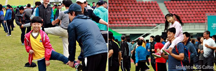 몸풀기와 비전보트 릴레이로 몸을 푼 다음, 이어 진행된 ‘구성원 명랑운동회’는 공 굴리기, 단체 줄넘기, 팀별 응원전, 통천 릴레이, 미션 임파서블(10인 10각, 협동 공 튀기기, 봉잡기, 파이프라인, 놋다리 밟기) 등의 순서로 진행되었습니다. 참! 이번 대회의 팀은 GS칼텍스의 조직가치인 신뢰, 유연, 도전, 탁월 등 4팀으로 구성되었습니다.