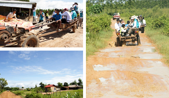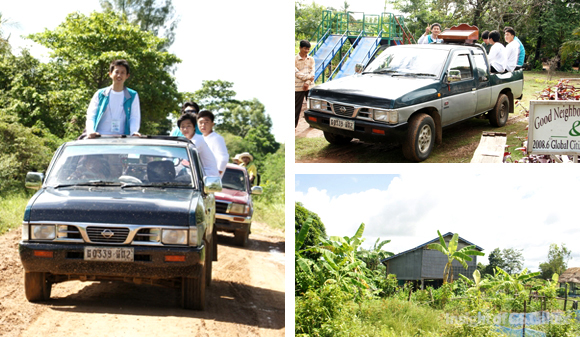 오늘은 어린이들을 만나는 날이에요. 어제 경험했던 뱅몽 가정집들보다 더 열악한 꼰뜨레이 지역의 초등학교를 방문하여, 즐거운 공부도 함께 하고, 운동회도 함께 합니다. 처음엔 기대가 되었는데 가는 길이 정말 꼰뜨레이 찾아 2만리… 저도 모르게 지쳐가더군요. 우선 어제의 폭우로 길이 좋지 않다 하여, 4륜 자동차로 갈아타기 위해 굿네이버스 센터로 갔습니다. 아름다운 하늘을 만끽하면서요. 그 후부터 진짜 모험시작! 사륜차에 탔는데요. 안에 타는 것이 아닌 밖에 탔어요. 군에 다시 입대한 것 같았습니다. 울퉁불퉁한 길 위에서 마구 흔들리느라 정신 없는데, 길이 더 안좋아진다고 경운기까지 딱하고 나타난 것이 아니겠습니까? 속으로 생각했습니다. 어제보다 더 오지로 들어가는구나. 집도 울창한 수풀 사이에 드문드문 보이고, 길은 온통 웅덩이였지만 경운기의 힘은 탁월했습니다. 대신 엉덩이가 얼얼하다 못해 없어지는 줄 알았죠. 하지만 고생 끝에 도착한 캄보디아 꼰뜨레이의 자연은 한없이 넓고 평온하기만 했습니다.