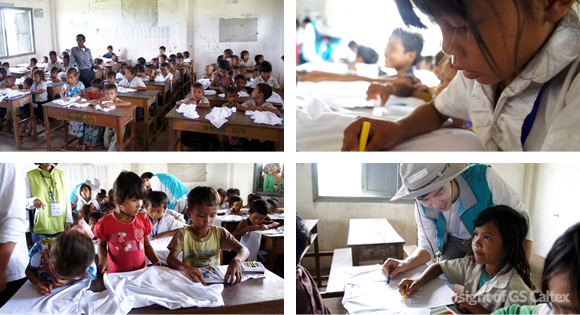 어린이들이 없었다면 황량하고 낡은 건물에 불과했을 이 공간이 기대와 설레임을 안고 찾아온 아이들의 미소와 웃음 소리로 훈훈하게 채워졌습니다. 누구보다 똘망똘망하고 사랑스런 눈빛을 한 어린이들을 보니 제 마음도 캄보디아의 하늘처럼 풍성하고 아름다워집니다. 한 시간 동안 우리는 흰색티셔츠에 그림을 함께 그렸습니다. 이 곳 어린이들은 미술시간이 없다고 합니다. 크레용도 처음이고, 그림도 처음인 어린이들. 함께 웃으며 그림 그립니다. 처음에는 신기한 듯 빤히 쳐다보더니 이내 먼저 마음을 열어줍니다. 제가 더 마음을 먼저 열고 다가갔어야 하는데 아쉽습니다. 다음에 인사할 어린이에겐 먼저 마음을 활짝 열고 다가갔어요^^