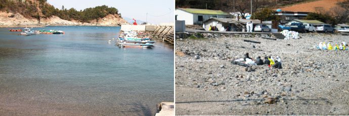 다만 아직 남해를 비롯한 일부 지역에서는 방제작업이 진행되고 있는데 신덕마을 해변에도 갯닦이를 하고 계신 주민분들이 간간히 보이네요. 영업중인 횟집의 상인분들 얼굴을 뵈니 죄송한 마음과 반가움이 교차합니다.