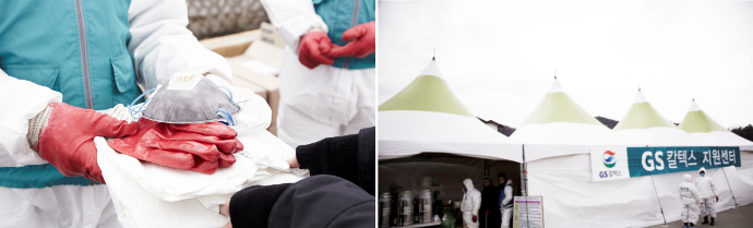 GS칼텍스 지원센터 천막에서는 주민분들을 포함하여 오시는 모든 자원봉사 분들을 위해 쉼 없이 커피를 타 드리느라 분주합니다. 겨울 바닷바람의 추위 속에 몇 시간 구슬땀을 흘리다 보면 금새 허기가 지는데 GS칼텍스는 방제활동에 참여하는 분들의 점심식사와 간식, 생수 등의 먹거리와 추위를 녹여줄 난방유를 비롯하여 간이화장실 등 편의시설을 준비했습니다. 혹시나 불편해 하실 분들에 대비해 여수보건소와 119에서는 구급차를 현장에 대기시켰고, GS칼텍스는 병원진료를 받으시는 분들의 의료비 역시 지원하였습니다.