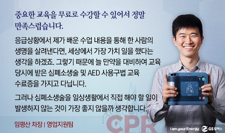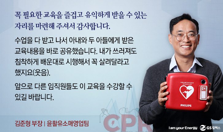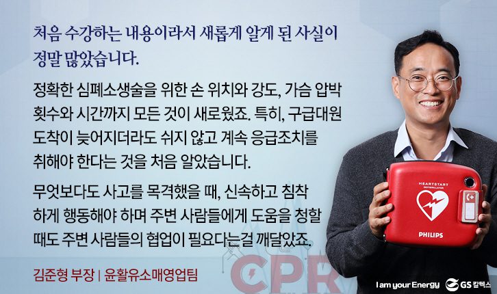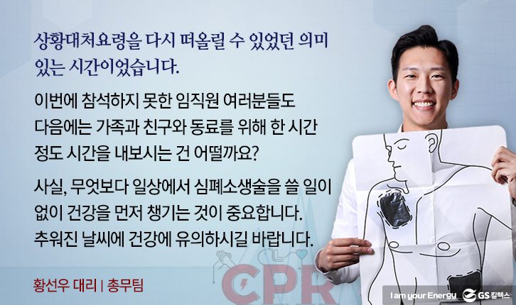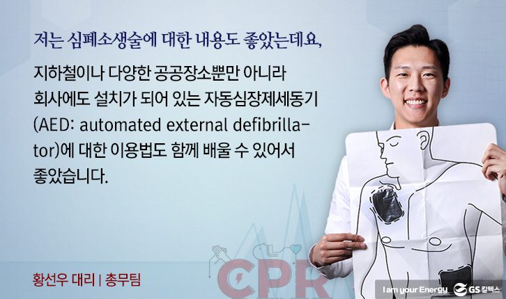 지난 11월 7일, GS타워 27층 컨퍼런스 룸에서 ‘심폐소생술 및 자동 심장 충격기 사용법’ 교육이 본사 임직원 50명을 대상으로 실시되었습니다.