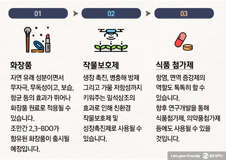 식물, 발효 음식, 인체, 토양 등에서 우리가 이미 알게 모르게 섭취 하고 있었던 2,3-BDO는 특이한 구조를 가졌기 때문에 일반적인 석유화학 공정으로 생산이 어렵습니다. 그렇기 때문에 아직 상업적으로 생산되거나 사용된 사례가 없죠. 하지만 GS칼텍스는 전 세계 최초로 2,3-BDO를 대량으로 생산할 수 있는 기술을 개발하였습니다.