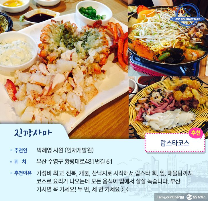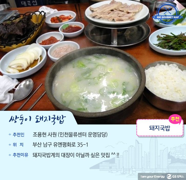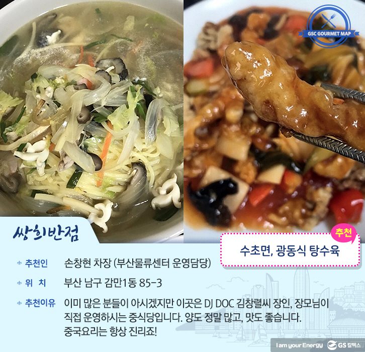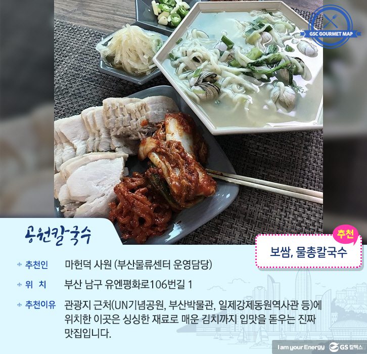 천혜의 자연조건을 말하는 ‘삼포지항(三抱之鄕)’은 바다와 산과 강을 동시에 품고 있는 고장을 일컫는 말입니다. 부산이 바로 큰 산과 바다를 끼고 낙동강을 접하고 있는 삼포지향의 도시라고 할 수 있습니다. 그렇기 때문에 자연환경적 조건을 잘 살리면서 전통과 역사까지 담긴 다양한 먹거리를 이곳에서 맛볼 수 있죠. 그래서 GSC 맛집 지도는 우리나라 제2의 도시 부산 맛집을 찾아 나섰습니다. 남녀노소를 막론하고 모두 다 즐길 수 있는 부산 맛집, 임직원들이 추천한 맛집 정보를 함께 보시죠!