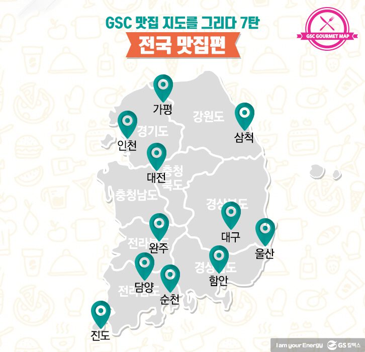 예로부터 우리나라는 지역별로 제철 재료와 해당 지역의 특성과 기후에 맞는 요리법이 발달하여 각 지역마다 특색 있는 음식들이 많이 있었습니다. 서울·경기권은 깔끔하고 담백한 맛을 특징으로 하고, 강원·경상권은 태백산맥과 동해안의 특산물인 산채류, 해산물을 주재료로 사용하였으며 충청·전라권은 서해안과 남해안의 풍부한 해산물, 산악지방의 나물류, 장류에서 독특함을 보이는 특징이 있습니다. 그래서 이번에는 <GSC 맛집 지도를 그리다 7탄>이 전국 각지의 다양한 맛을 알아보고자 질문을 던졌습니다. 여러분의 지역 대표 맛집은 어디인가요?