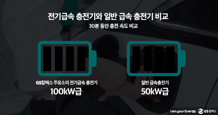 지금까지 서울 도심에는 50kW급 일반 전기차 충전기가 주로 설치되었는데요. 이번에 GS칼텍스는 처음으로 서울 도심 주유소에 100kW급 전기차 급속 충전기를 설치했습니다. 이 급속 충전기로는 일반 충전기의 2배 속도로 전기차를 충전할 수 있습니다. 30~50kW 용량의 일반적인 전기차는 급속 충전기로 30분이면 약 250km를 주행할 수 있을 정도로 충전이 가능합니다. 급속으로 70~80% 충전되면, 자동차 배터리 보호를 위해 충전 속도가 낮아집니다.