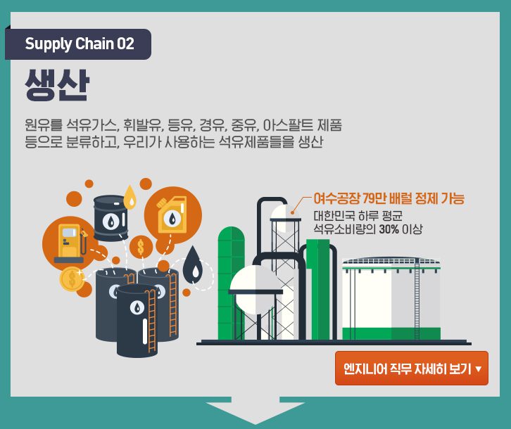 생산본부 여수공장은 실질적으로 원유를 도입하여 휘발유, 경유, 벙커씨유 등으로 분리하고 우리가 사용하는 석유제품들을 만들어내는 곳입니다. 상압증류탑을 비롯하여 석유화학, HOU공정들이 유기적으로 연결되어 고부가가치 제품생산을 통해 수익성을 창출하고, 이러한 공정들의 생산 활동이 효율적이고 안정적으로 이루어질 수 있도록 노력하고 있습니다. 다양한 팀들이 모여 제품생산 운영계획에 따라 각각의 공정운전을 관리하고 공장설비를 안정되게 유지, 보수 및 개선 하는 등 여러 업무를 수행하고 있습니다.