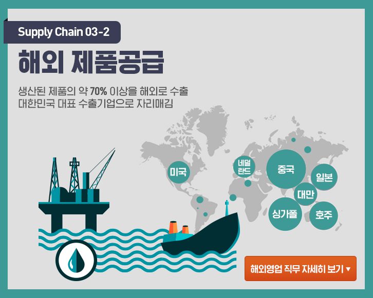 저는 PX(파라자일렌) 제품 수출(해외영업) Operator로써 제품 Logistics가 문제없이 진행 될 수 있도록 제반업무를 수행하며 제품 판매에 따른 고객불만 또는 요청사항 발생 시 고객지원 업무도 병행하고 있습니다. 용선 및 운반, 납품, 재고/채권 관리, 제품 스케쥴링, 출하 및 운송, 관련 서류 작업 등이 주요 업무라고 볼 수 있습니다. 싱가폴/중국/대만/일본 등 해외 고객과 실시간으로 업무를 수행하고 주로 영어를 사용하여 업무를 진행합니다. 간혹 필요 시 중국어와 일본어를 사용해야 하는 경우도 있습니다.