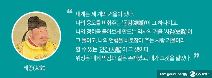 이것이 바로 그 유명한 태종의 ‘삼감’입니다. 태종은 자신의 말과 행동을 바로잡아 주는 위징을 거울에 비유하며 충신의 직언과 충언을 중시했던 것입니다.